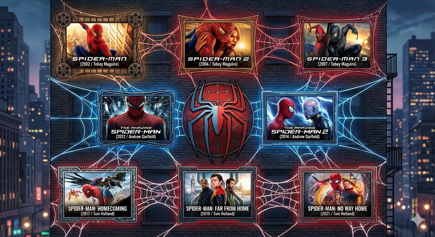 スパイダーマン3シリーズ(トビー/アメイジング/ホランド)と、MCUフェイズ1〜3の全映画、さらにアニメ版スパイダーバースまでを「一本の流れ」としてすべて観る場合の順番と上映時間です。